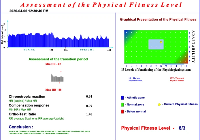 Using heart rate variability (HRV) measurements and gentle challenges, this test assesses how well your nervous system adapts to stress and returns to balance. It provides insight into the relationship between the sympathetic (“fight or flight”) and parasympathetic (“rest and digest”) systems.